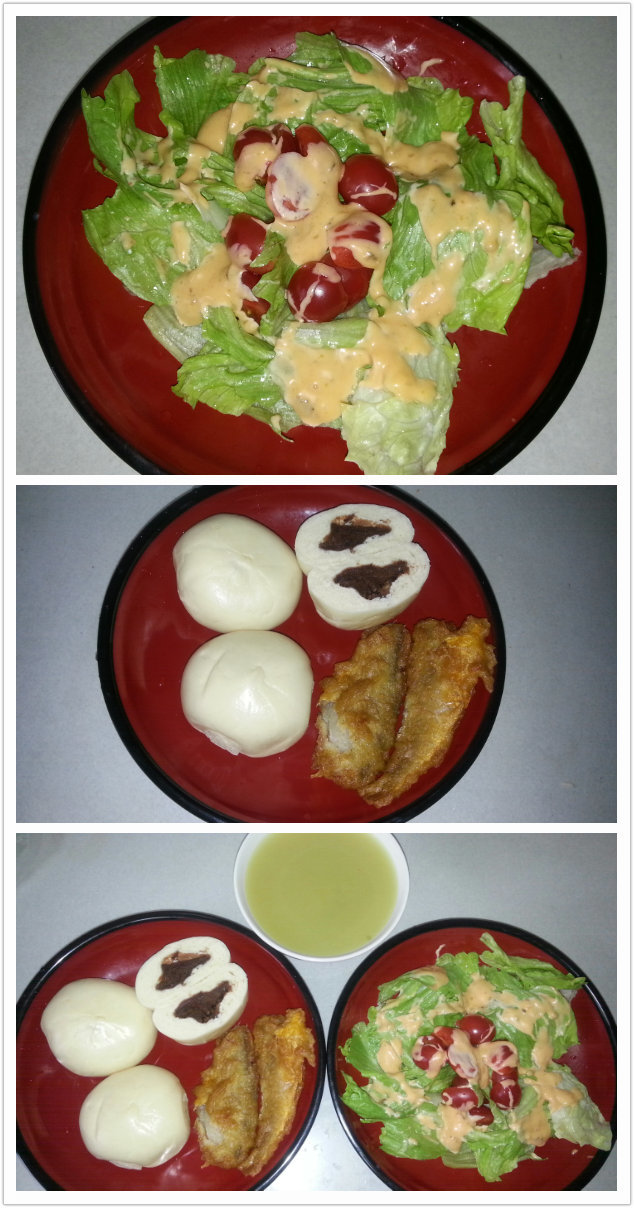 超市买的现成的豆沙包,早晨起来热一下就ok,头天晚上剩的煎黄花鱼两条、一盘蔬菜沙拉、一碗绿豆粥!