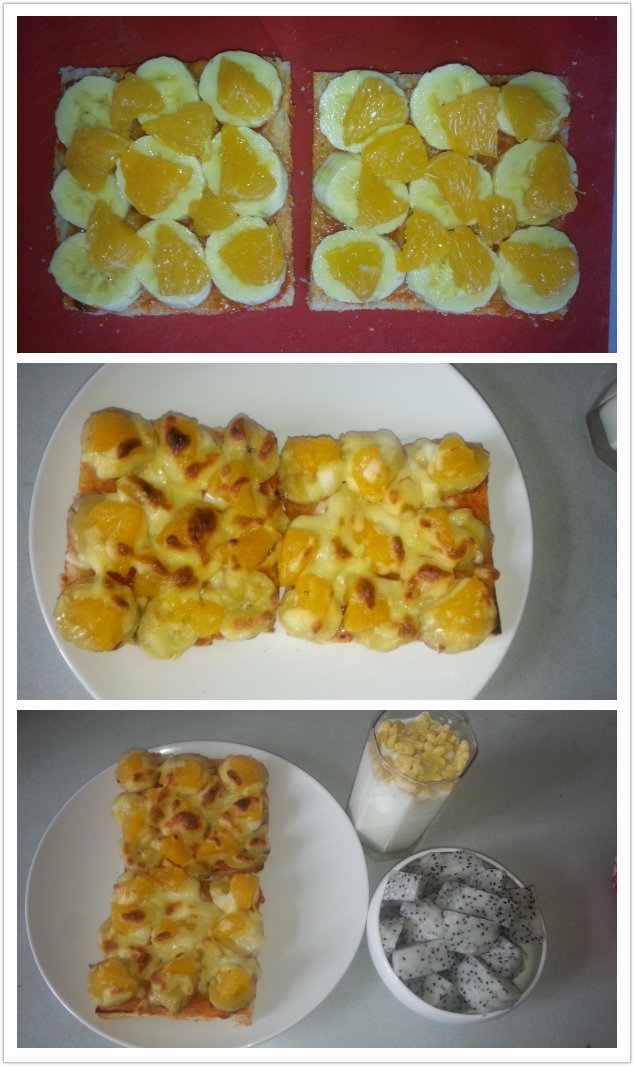 两片土司去除四个硬边后抹上批萨酱、放上香蕉、橙子、奶酪,入烤箱上下火220度烤七分钟即可!搭配一份火龙果和一杯脆谷乐,营养即全面又均衡!喜欢吃香蕉的话一定要试试这款批萨,因为香蕉烤过之后会出奇的香甜!