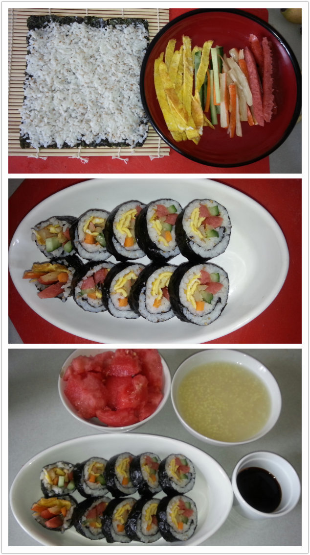 温热的米饭用芝麻、香油、盐拌好,均匀铺在紫菜上,把香肠、黄瓜、胡萝卜、甜萝卜、鸡蛋片、蟹棒码放在铺好的米饭上,用珠帘卷起切段即可!搭配一碗小米粥、一份西瓜!头天晚上睡觉前做好也可以,这样就不用早起了哦!