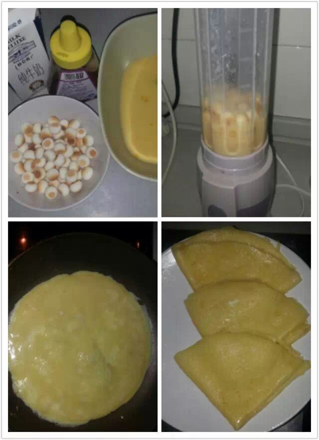 超市买的旺仔小馒头跟牛奶一起打碎,加入白糖和鸡蛋一起搅拌成面糊,平底锅刷油,用最小的火把饼片煎熟,出锅后沾番茄沙司吃!再搭配一杯热牛奶就OK了!需要注意的就是一定要用最小的火,这样煎出来的饼口感又软又Q,非常好吃!
