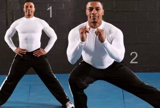 侧弓步针对臀部外侧肌肉和臀部肌肉,并可调整大腿内侧形状。动作要领:两腿大幅度向身体两侧分开,一边膝盖向侧前方弯曲。保持胫骨在弯曲的膝盖下方,并垂直于地面。做动作时,身体向侧边稍倾斜,但肩膀不要超过膝盖对应的位置,以免受伤。同时手部做恰当的动作保持平衡。