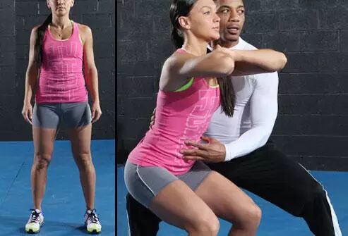 臀部锻炼的主打动作就是“蹲坐”。蹲坐时直接调动臀部肌肉,完成动作的关键是:保持重心。动作要领:双脚分立,与肩同宽,跨步缓缓下降,想象自己坐在一张隐形的椅子上,然后恢复站立姿势,确保膝盖不超过脚尖,保持躯干收紧,背部伸直。